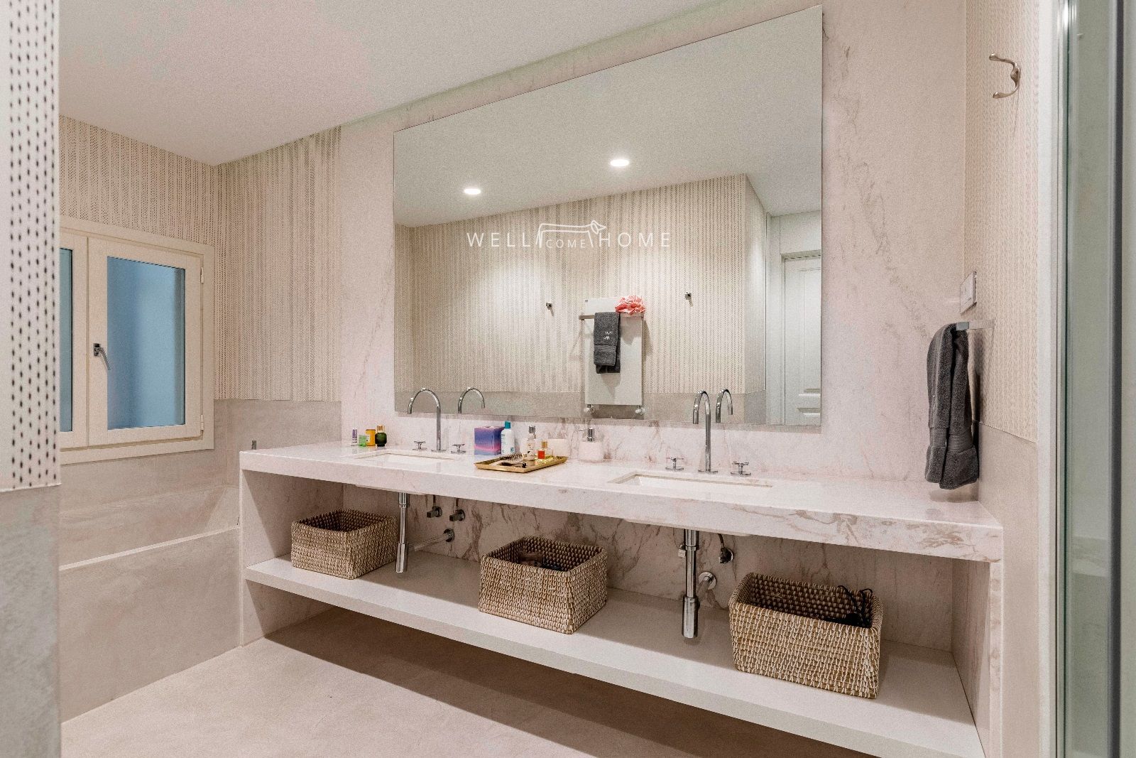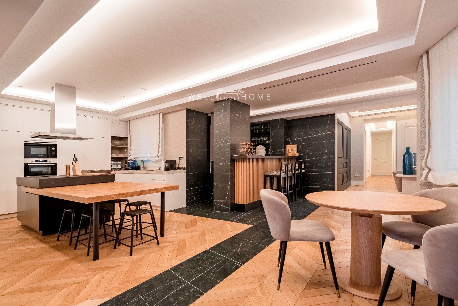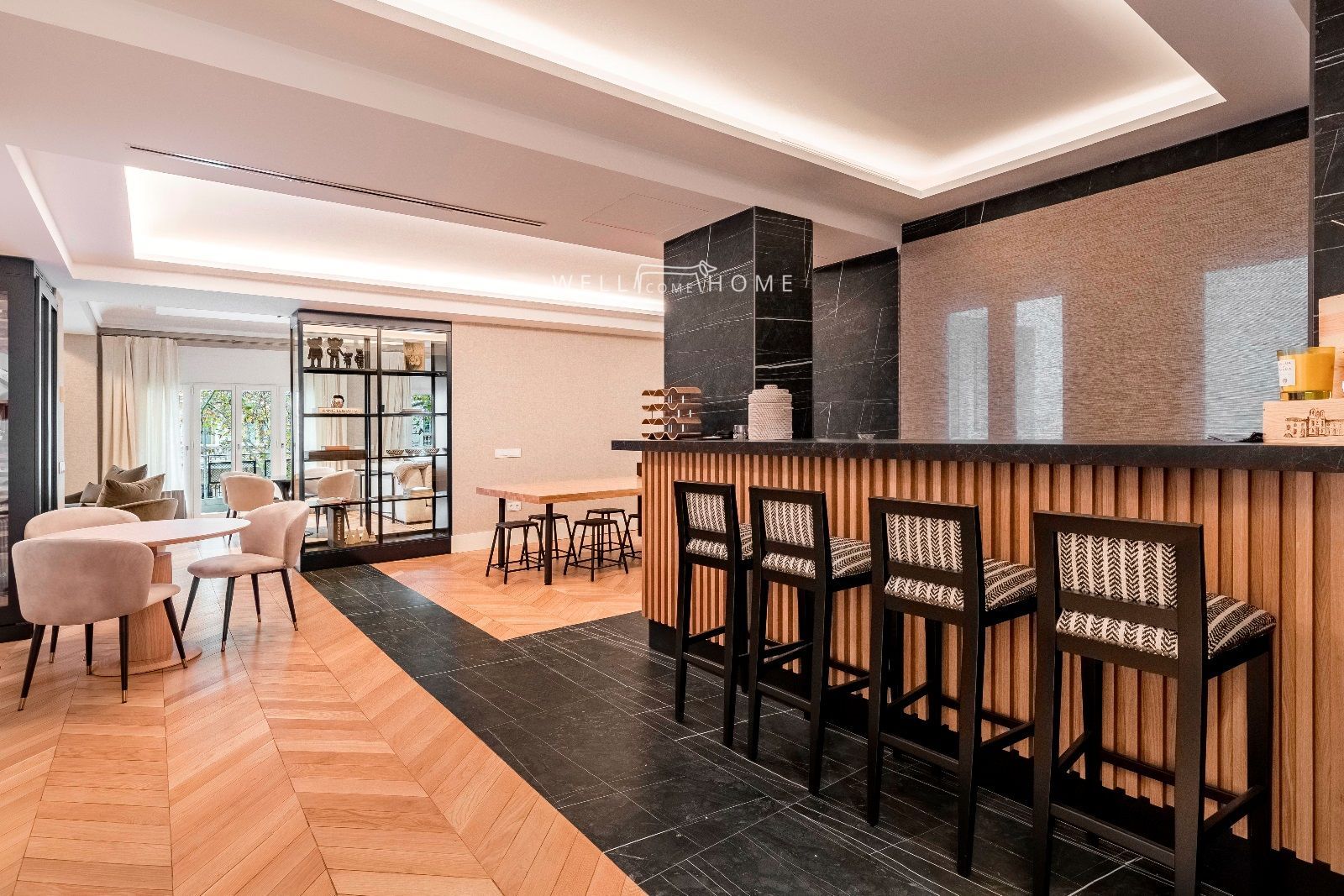 Nos adentramos a través de un elegante hall que nos conduce a una impresionante zonal social distribuida en cuatro espaciosos ambientes: Elegante bar, cocina de diseño, comedor, y doble salón con chimenea.Conectada con una encantadora terraza, el área de día se baña de luz todo el dia gracias a sus amplísimos ventanales con vistas despejadas.