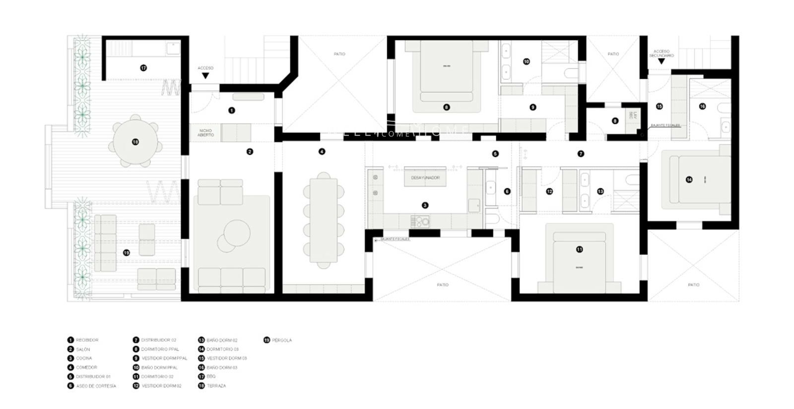 La zona de descanso se compone de tres dormitorios, todos ellos en suite, ofreciendo máximo confort, privacidad y una distribución pensada para un estilo de vida contemporáneo.