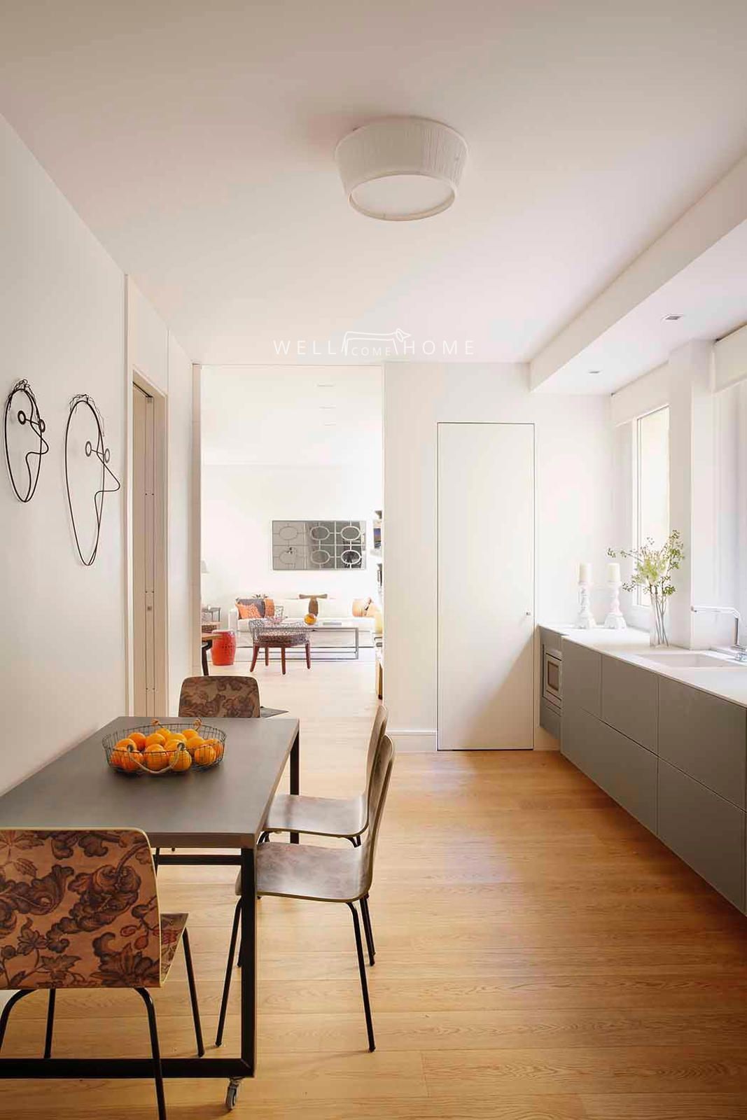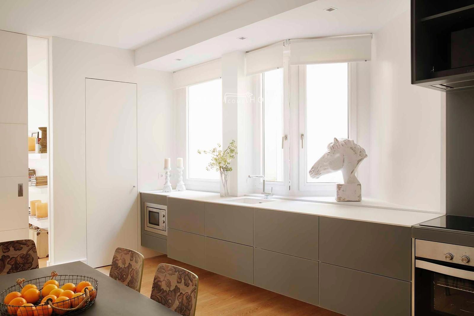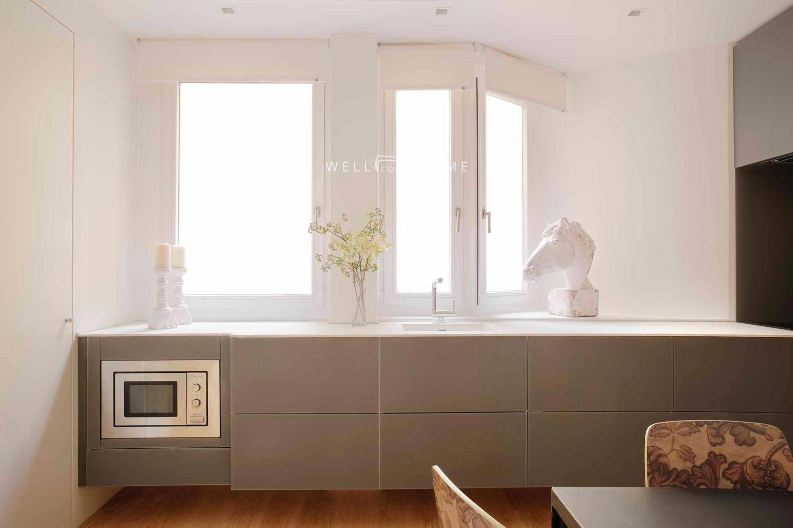 El piso completamente amueblado cuenta con la siguiente distribución: amplio recibidor que da paso a un espacioso salón/comedor muy luminoso abierto a una cocina completamente equipada.