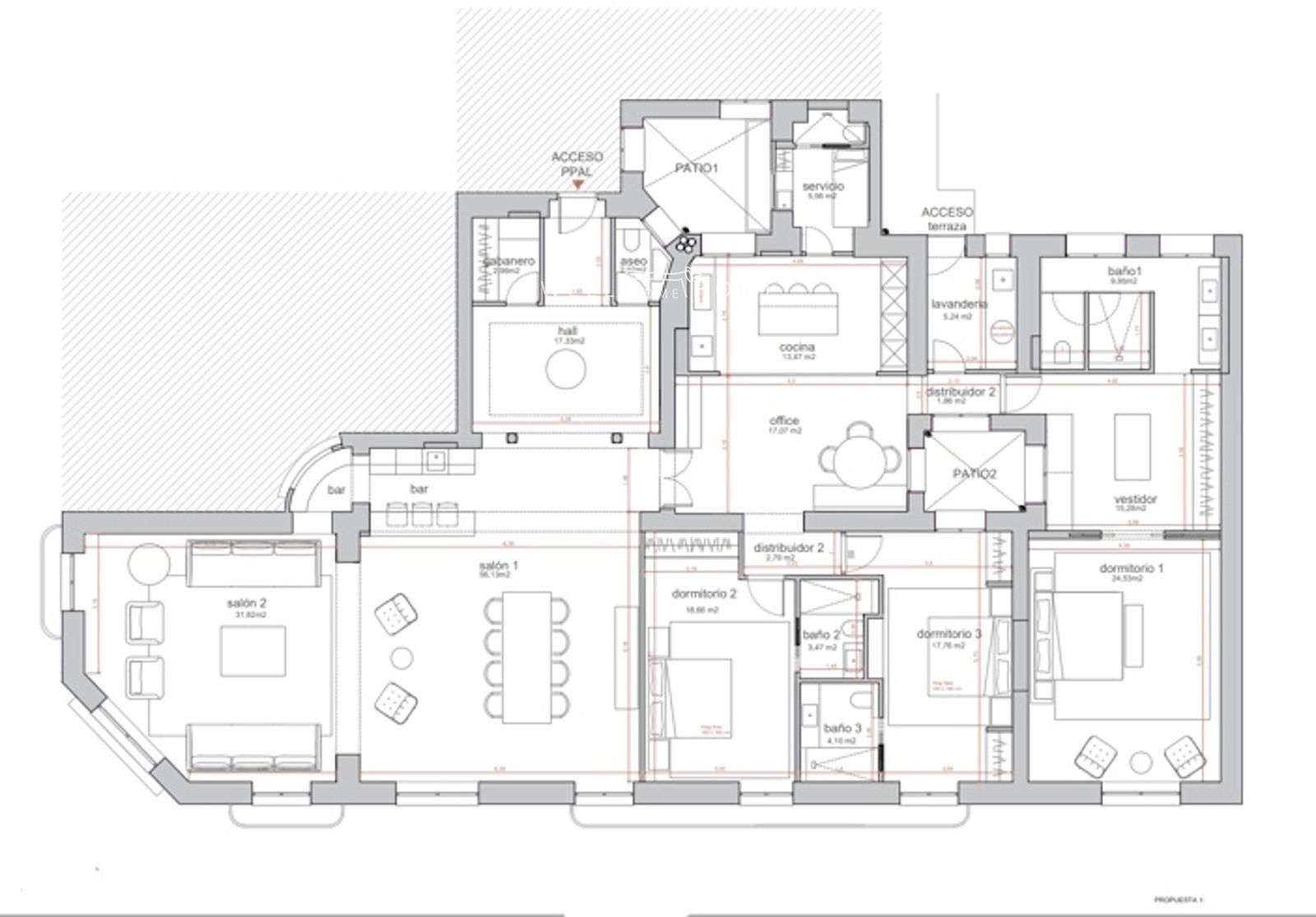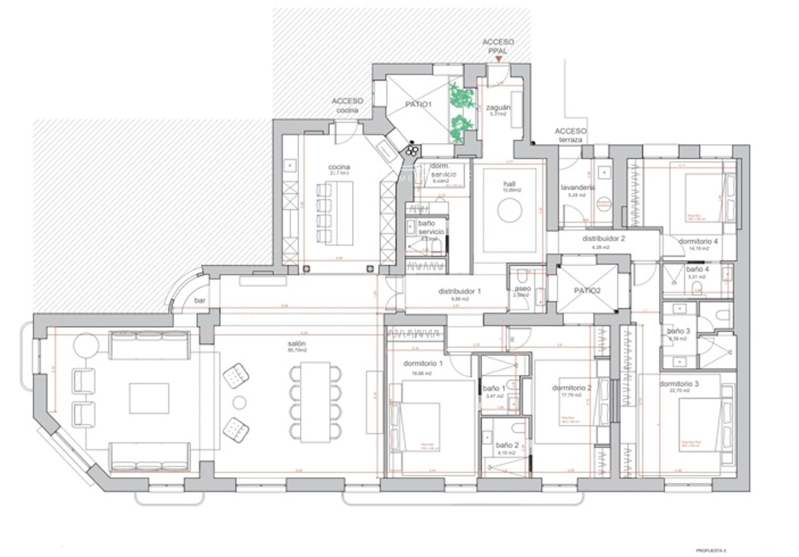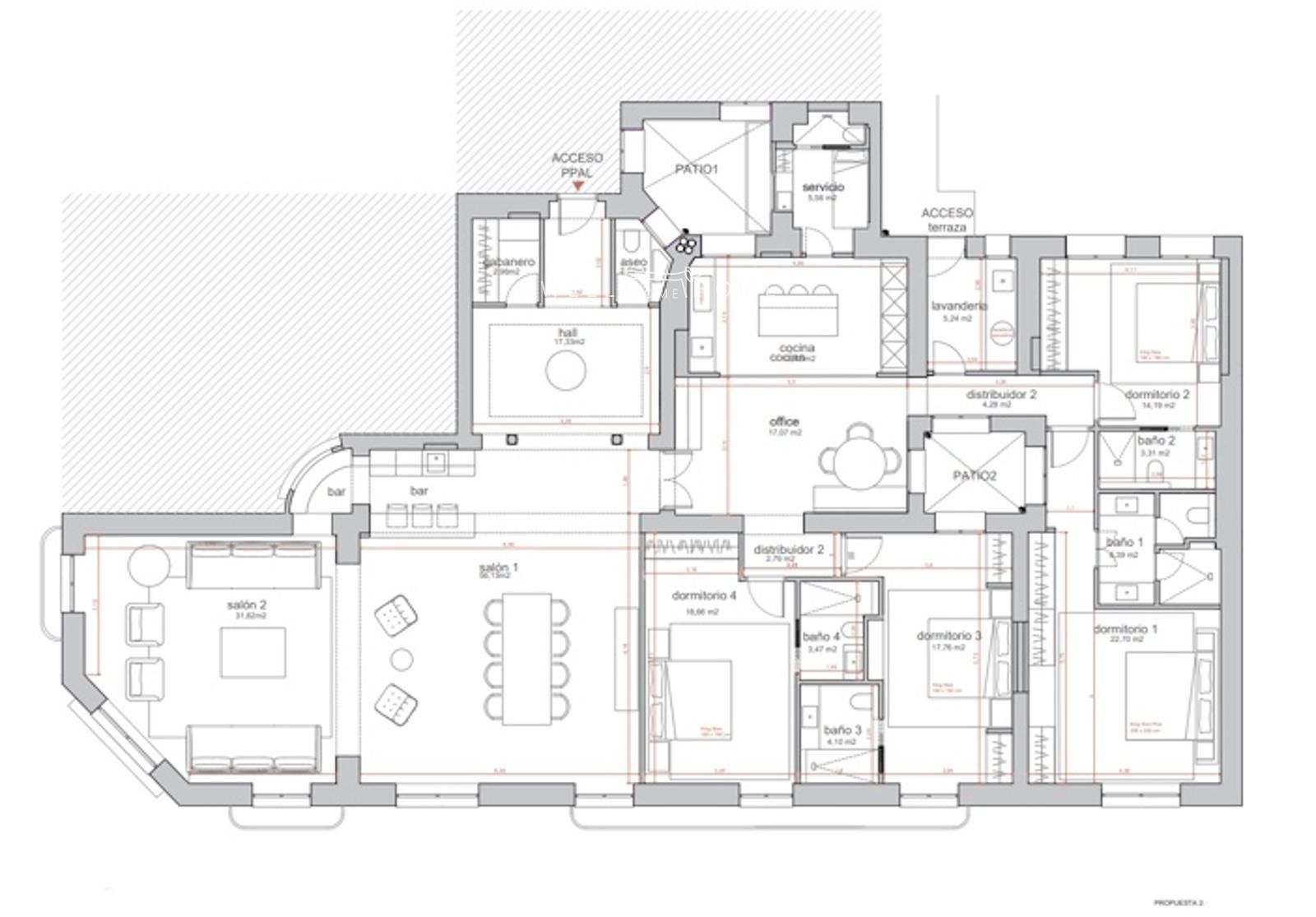 Las propuestas contemplan distintas configuraciones de la zona de descanso: una opción con tres dormitorios en suite más dormitorio de servicio en suite y aseo de cortesía; otra con cuatro dormitorios en suite más dormitorio de servicio en suite y aseo de cortesía; y una tercera con cuatro dormitorios en suite más dormitorio de servicio con baño independiente y aseo de cortesía. Una excelente oportunidad para diseñar una vivienda única en una de las zonas más demandadas de Madrid.