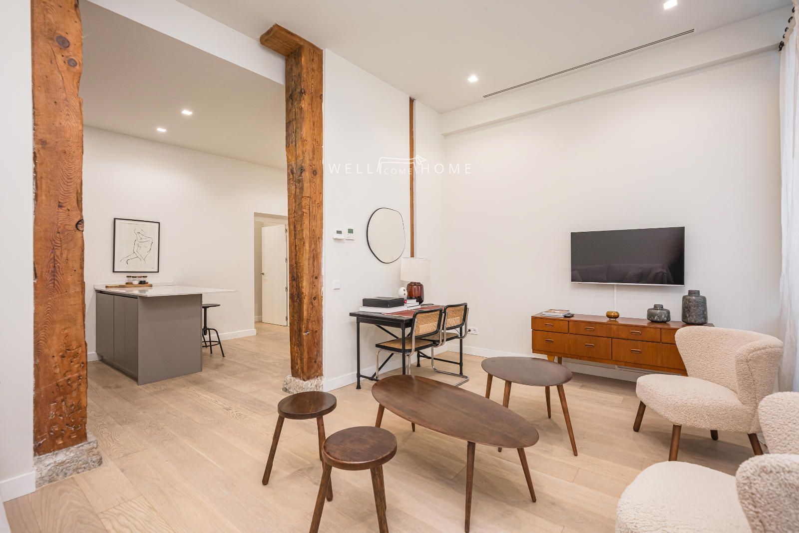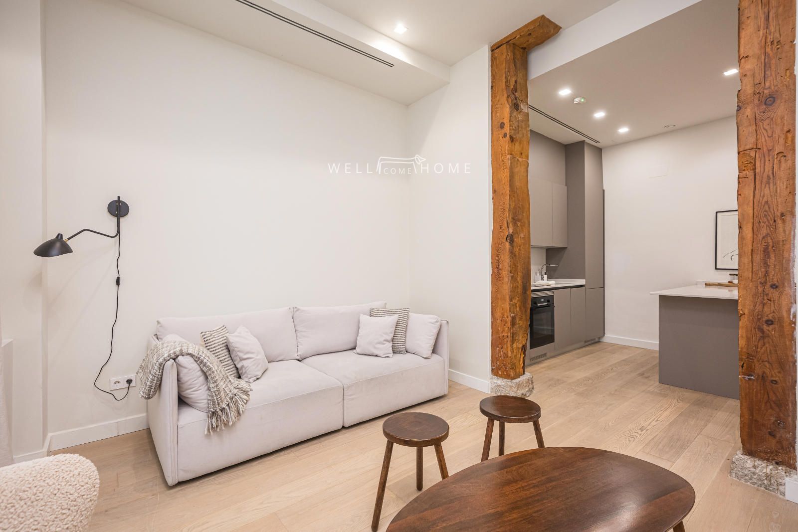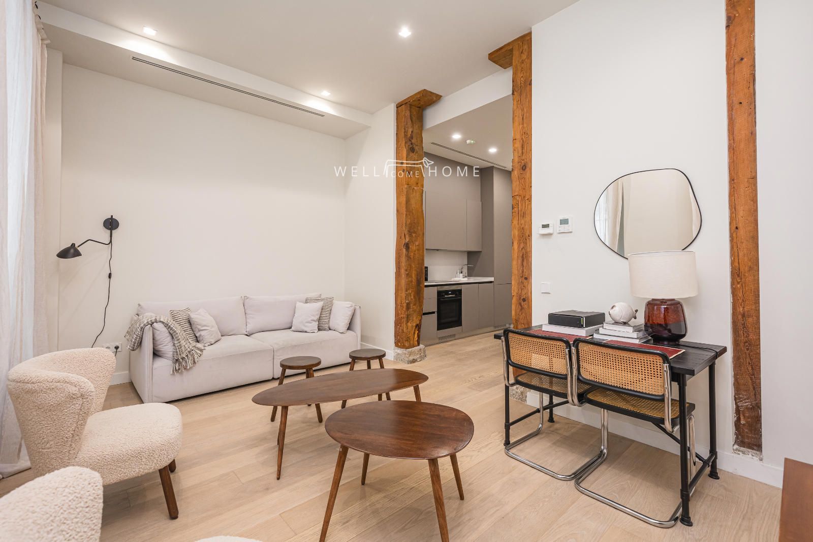 El piso completamente amueblado cuenta con la siguiente distribución: amplio recibidor que da paso a un espacioso salón/comedor, muy luminoso con dos ventanas exteriores con vistas a la calle. El piso además cuenta con una cocina abierta completamente equipada.