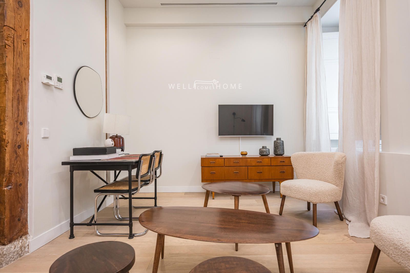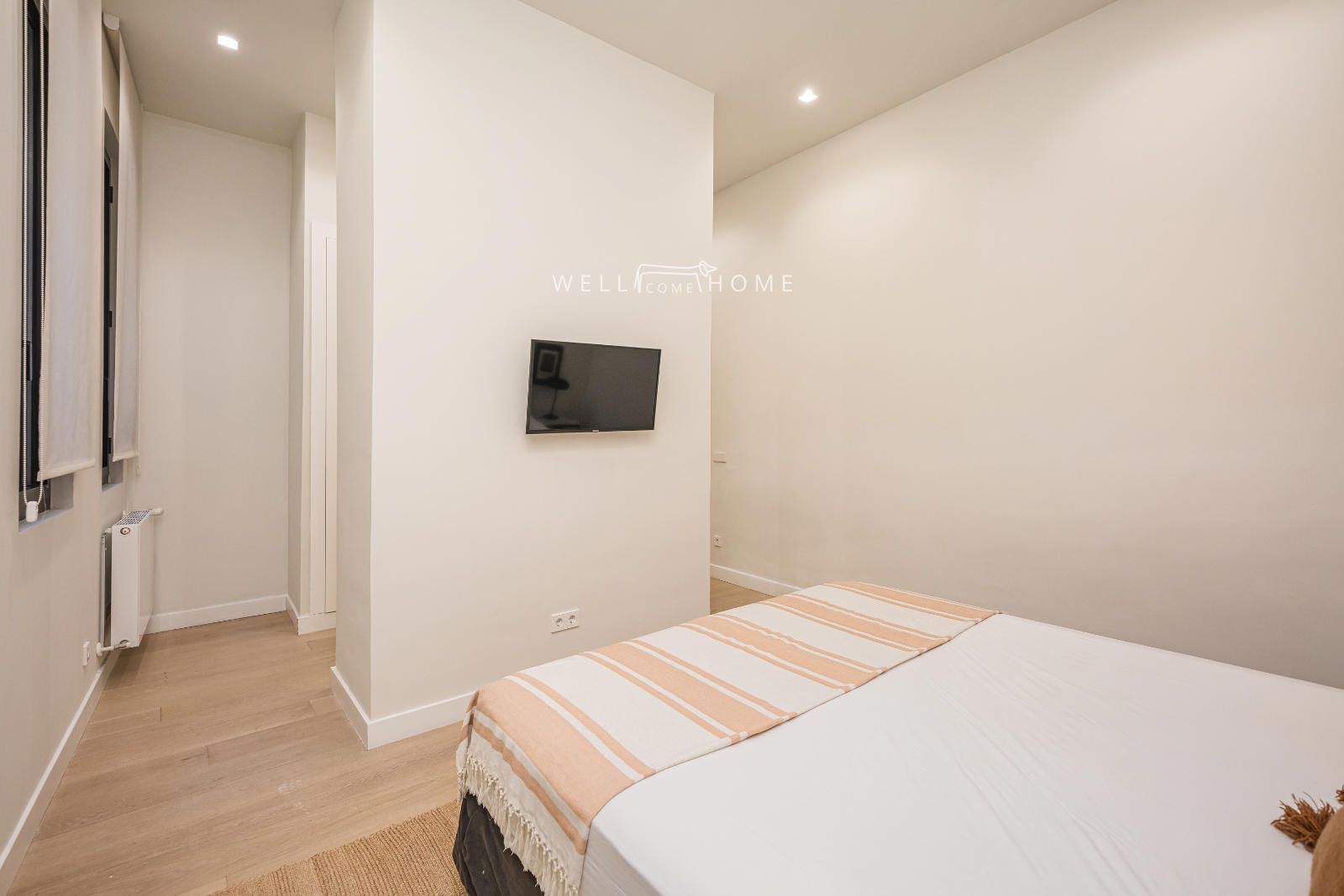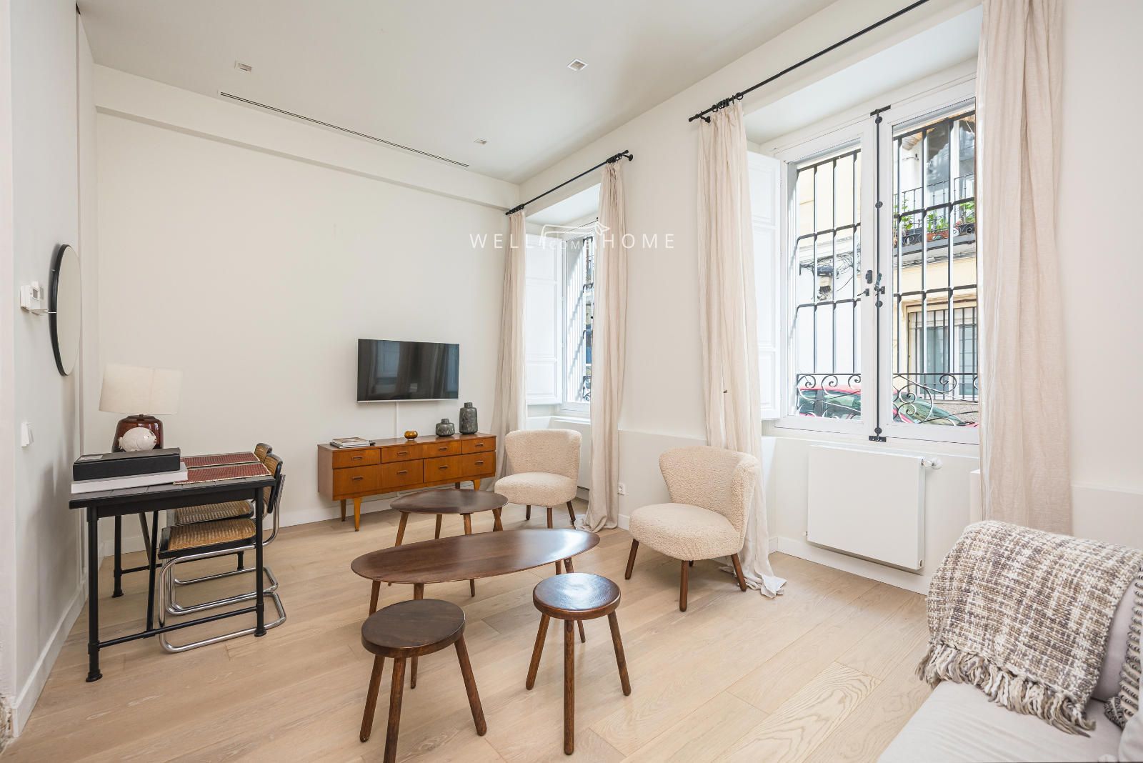 El piso completamente amueblado cuenta con la siguiente distribución: amplio recibidor que da paso a un espacioso salón/comedor, muy luminoso con dos ventanas exteriores con vistas a la calle. El piso además cuenta con una cocina abierta completamente equipada.